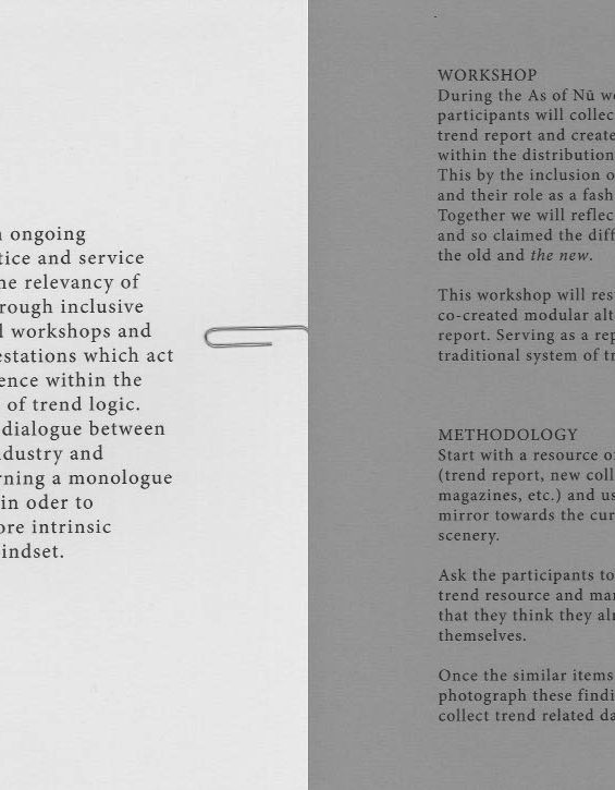 Through this hands-on process, participants questioned what truly makes something new, how much value lies in subtle differences, and how personal wardrobes intersect with broader trends. The outcome was a co-created, modular alternative trend report—one entry per participant. More than a finished product, this evolving trend book invites ongoing contributions, encouraging participants to continue exploring the shifting boundaries between old and new.